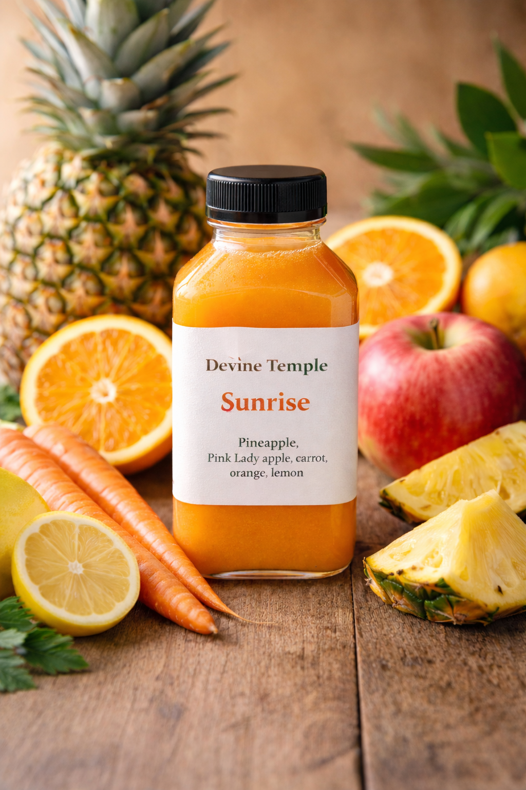 Made with pineapple, Pink Lady apple, carrot, orange, and lemon, Sunrise is naturally rich in vitamin C and plant-based antioxidants. This cold-pressed juice offers a clean burst of hydration and natural energy without added sugars or preservatives. Light, refreshing, and grounding, it’s a great option for mornings, mid-day resets, or an easy introduction to cold-pressed juice.
